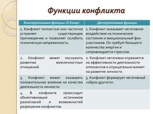 Избор начина за решавање сукоба зависи од конкретне ситуације. Сукоб у друштву може довести до различитих резултата. Последице су или позитивне или негативне. Функције социјалног сукоба су конструктивне. Позитиван резултат може бити стимулација прогресивних промјена у друштву. Низ других предности сукоба: елиминација нагомиланих контрадикција, окупљање супротстављених група, јачање консолидације унутар сукобљених кампова. Захваљујући мобилизацији снага зараћених страна, развијају се нове идеје, понекад се откривају нове технологије.